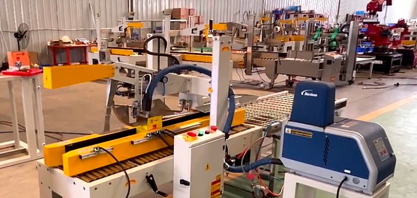 热熔胶折盖封箱机是一款既高效又环保的自动化包装设备,该机可以选择只热熔胶封箱,也可选择热熔胶与胶带同时封箱,效果更佳。艾讯热熔胶封箱机配置美国诺信胶机,性能稳定,喷胶效果好,售后有保障。广泛用于食品、药品、化工、电商等领域。