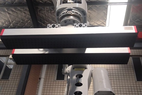 军工行业包装线的最大特点就是物料重、体积大,因此在码垛机器人的选择上也必须配套大负载、频率高且运行稳定的设备,同时可配以顶压机芯捆扎机,实现PET带的井型捆扎,可将物料与托盘紧密的固定,同时配以悬臂缠绕包装机,实现双重保护。