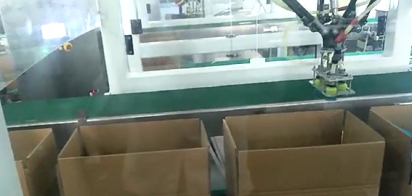 并联机器人装箱机也称蜘蛛手装箱机,是一款速度比较快的装箱机,该机采用PLC控制,配合自动机械手(抓手样式可选),实现对小物品的自动装箱作业,主要用于小袋产品或小盒产品的的装箱,多用于食品、药品、化工等包装领域。